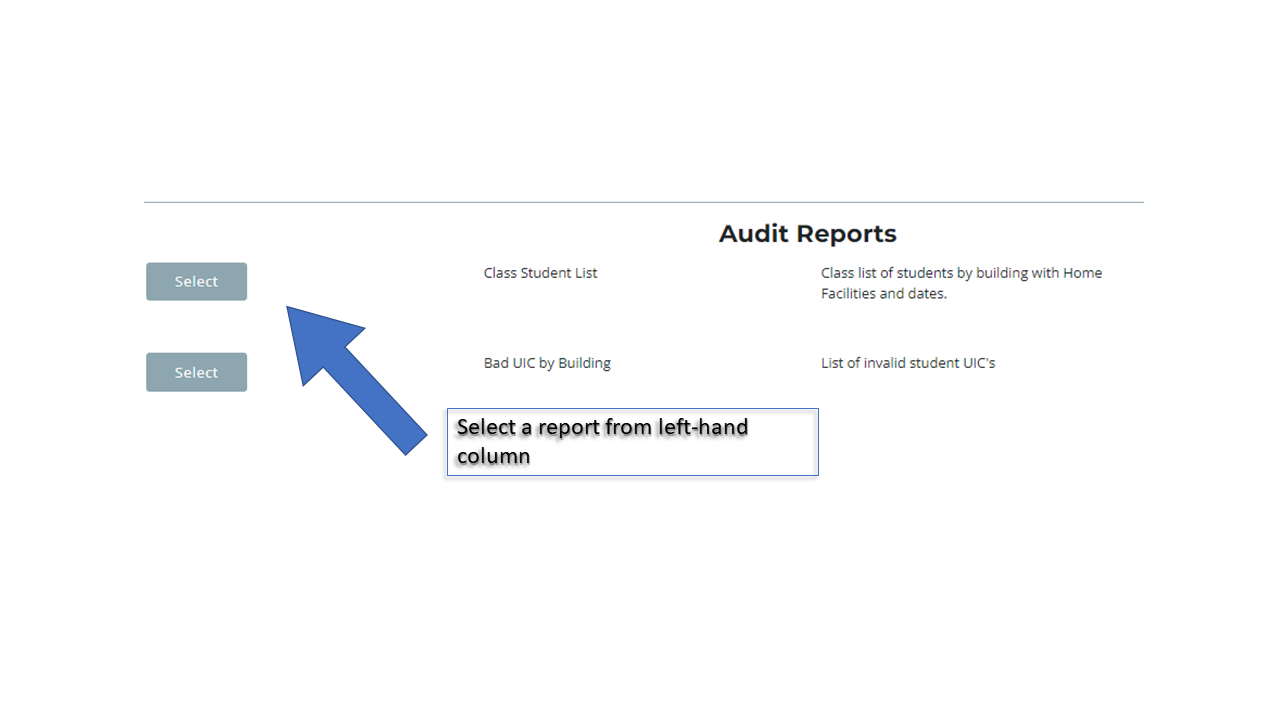 To access reports visit: cteis.com and use login credentials. Select Reports from the top menu bar and then select Building Reports from the drop-down menu. Under the Audit Reports header on the Building Report Launcher page, choose a report to review and click the select button on the left side. The next page will prompt you to select building from a drop-down menu. On the next page, Select the criteria from the right-hand panel (sort by enrollment, CIP Name, and Year).